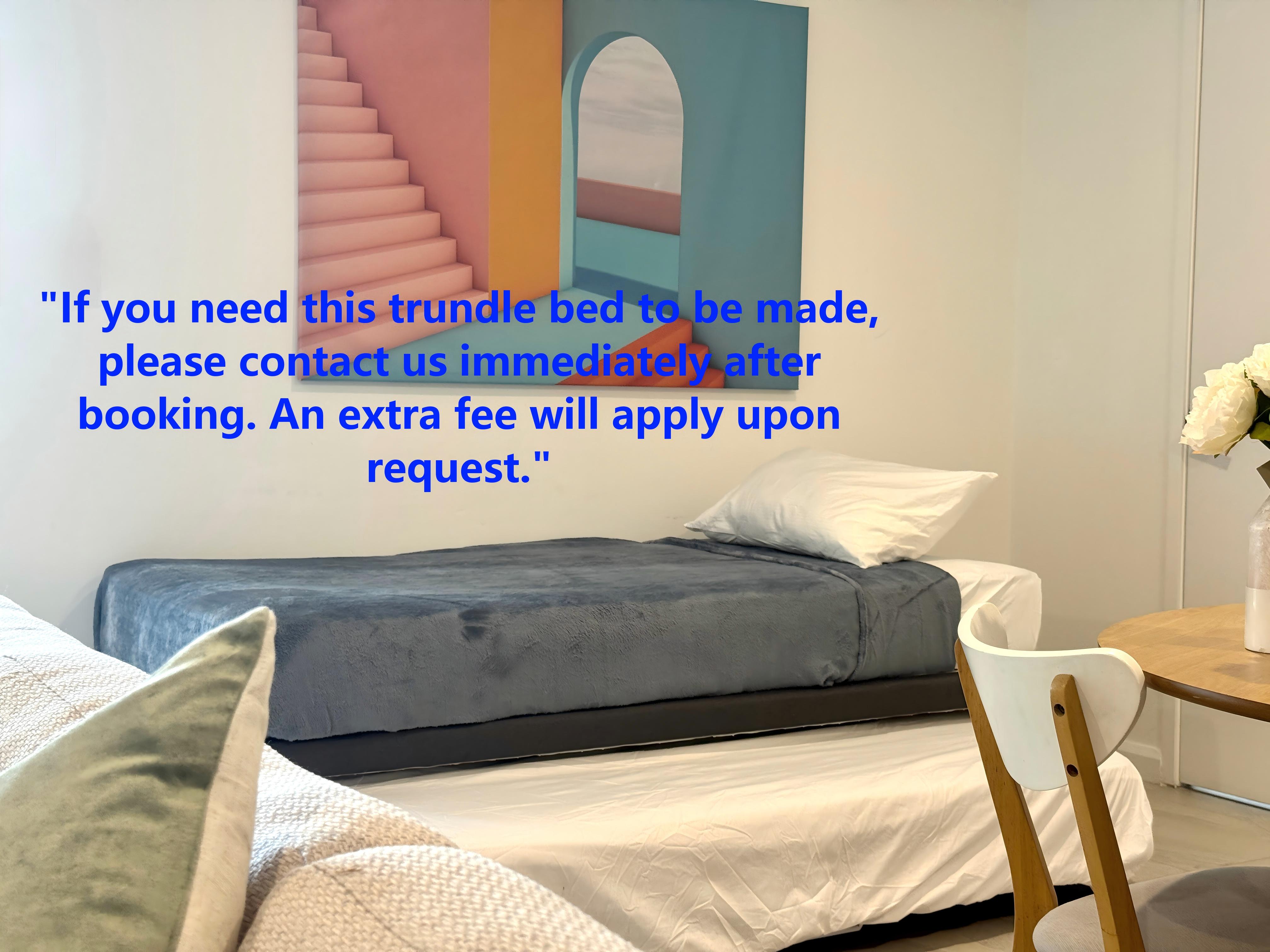 This charming and spacious one-bedroom granny flat offers everything you need for a comfortable and relaxing stay. Thoughtfully designed, the flat features a bright living area, a fully equipped kitchen with an oven, and an in-unit washing machine for added convenience. The bedroom includes a comfortable queen bed, and the living room is furnished with a cozy trundle bed that can comfortably accommodate extra guests. If you’re booking for more than two people, simply let us know in advance — we’ll happily prepare the trundle bed with fresh linens, pillows, and all essentials to ensure a pleasant stay. Perfect for both short visits and longer stays, this private self-contained flat provides comfort, functionality, and a peaceful environment close to everything you need.